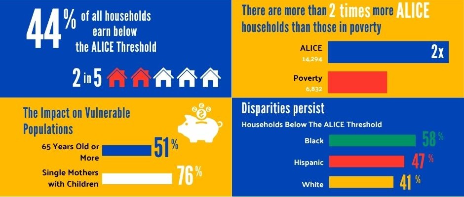 Who is ALICE? It stands for Asset Limited, Income Constrained, Employed; and is a measure of financial hardship among working individuals and families. Anyone can be ALICE, whether it is a relative, a neighbor, your healthcare provider, the cashier who checks you out at the grocery store, or even yourself.